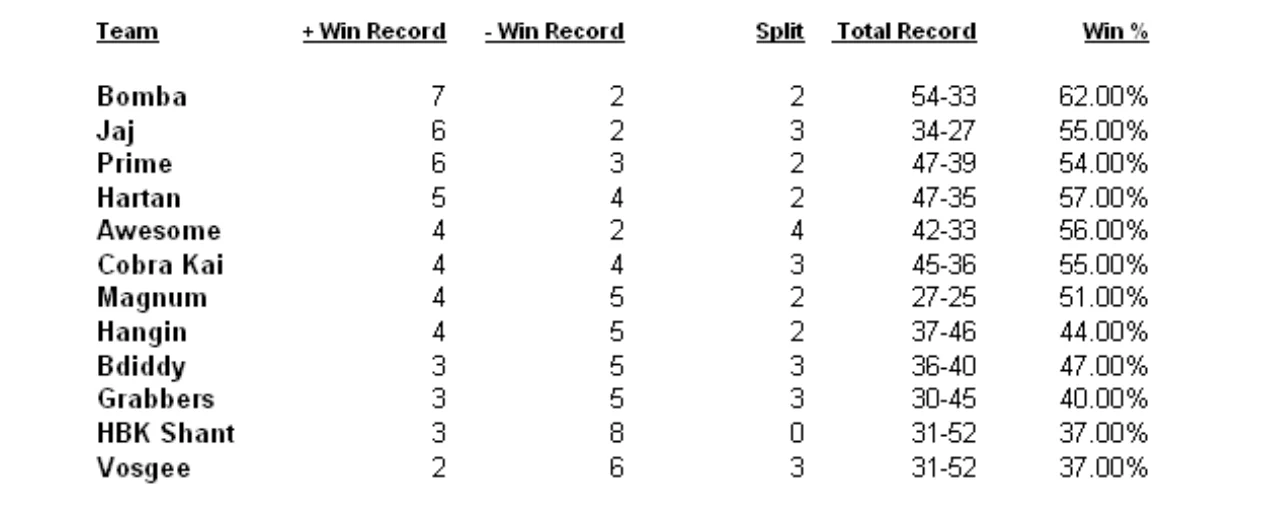 A couple of things jump out immediately when looking at the historical records. Both Vosgee and HBK have been getting their ass kicked over the years. From the chart, Gyank has had five different teams (Bomba, Hartan, Hangin', Magnum, Prime Time) thump him over the past seven years, leaving a head-to-head record against those managers with a difference of more than 3 in the win-to-loss column, the most of any manager. HBK comes in at a close second with four different teams dishing out the services.