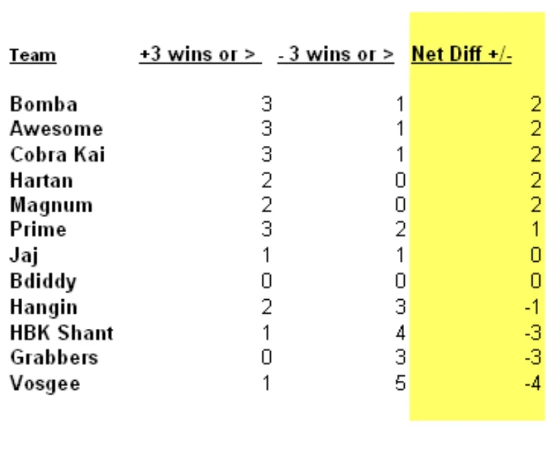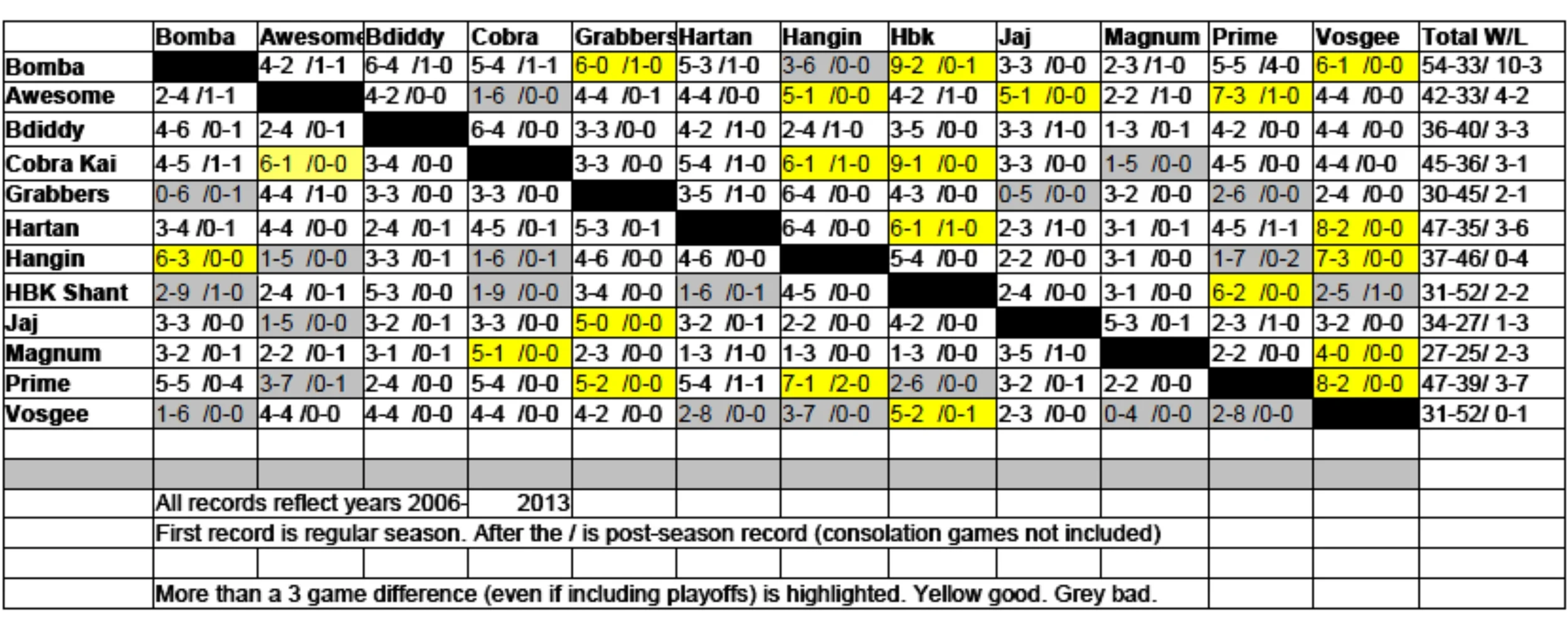 The chart reads from left to right starting with Bomba at the top row, then going down to Awesomeness, then BDiddy's win/loss totals. The yellow highlighted boxes show match-ups that have a margin greater than 3 games in the win column for a team. The grey boxes show match-ups that have a margin greater than 3 games in the loss column against a team.